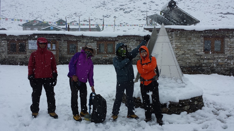 When the cyclone hit the Bay of Bengal which affected the eastern parts of Nepal, we had arrived at Pheriche (4200m a.s.l). According to the reports from The Himalayan Times , ” It rained at some places in the eastern Nepal, and the Kathmandu Valley also witnessed a drizzle this morning and afternoon.”  The lower lands experienced long hours of rain, while at the Everest region, we experienced two full days of snow that painted the villages white. It was like a dream winter-land overnight and, Christmas arrived earlier than expected!